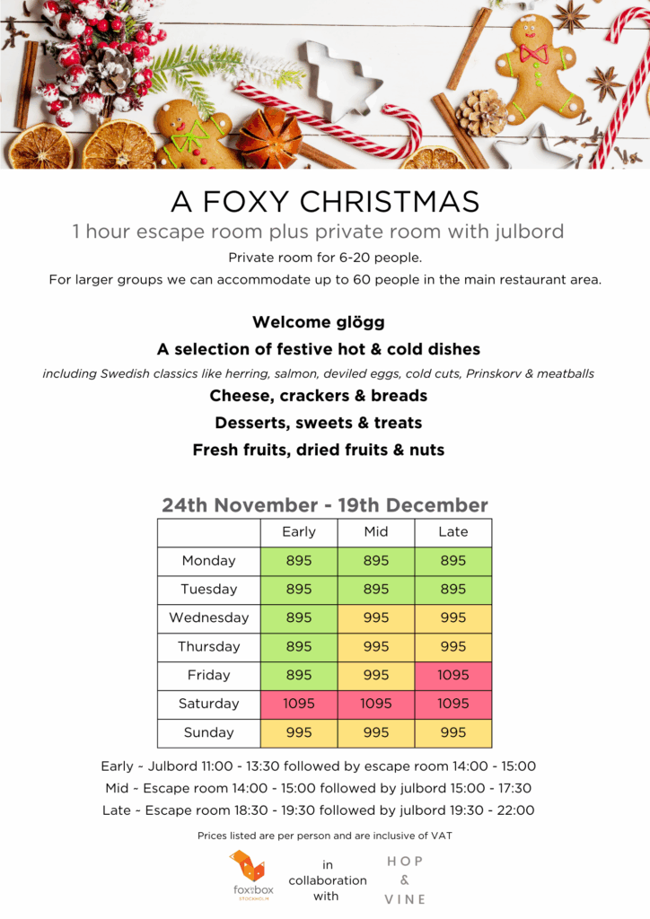 Fox in a Box Stockholm will be providing the fun while Hop & Vine will be providing the food. The escape rooms and julbord are all under one roof so you don’t have to brave the cold.
